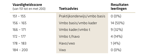 Ten slotte deden op onze school 28 leerlingen mee aan de doorstroomtoets. Zij behaalden de volgende resultaten: